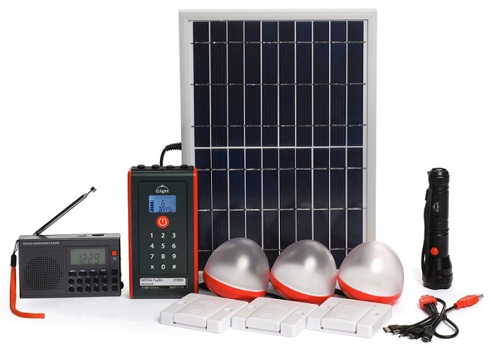 d.light’s D30 system operates like personal power grids for homes or small businesses. It includes a solar panel, mobile phone charger, solar lights, light switches, a torch and an FM radio. The lights can last up to 17 hours on the low setting and are 12 times brighter than kerosene. Payment plans vary depending on the country.