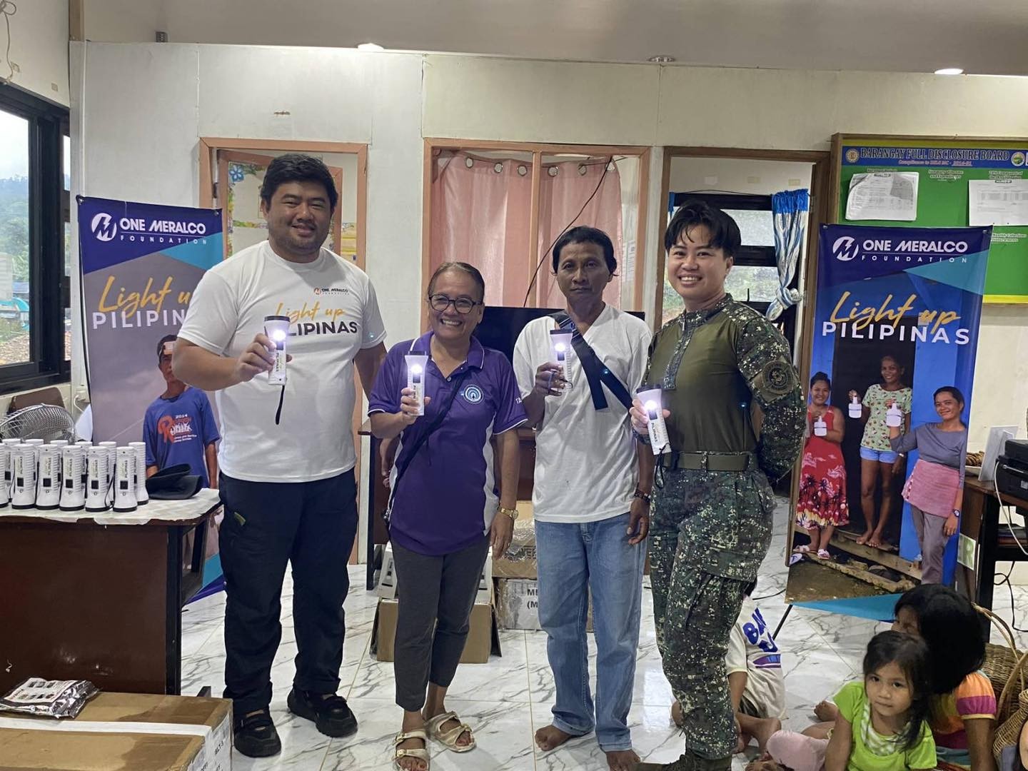 The Light Up Pilipinas program of One Meralco Foundation, in collaboration with the Philippine Marine Corps' Marine Battalion Landing Team-9 (MBLT-9) and Power 4 All, provided solar torches to over 100 families, including those belonging to the indigenous Tagbanua tribe, in Sitio Bayatao and Sitio Kayasan, Barangay Tagabinet, Puerto Princesa City, Palawan.